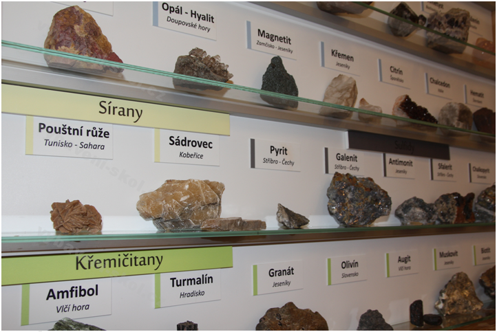 Atraktivně zpracovaná nástěnná vitrína představuje typické zástupce minerálů z našeho území, ale i ze světa. Minerály jsou rozděleny do skupin: prvky, sulfidy, halogenidy, oxidy, uhličitany, sírany, křemičitany a jsou v počtu 35 exponátů. Jedná se o typické zástupce, které žáci a pedagogové znají z učebnic přírodopisu a biologie. Vitrína je rozměrů je dřevěná se skleněnými policemi a vpředu opatřena bezpečnostním sklem. Dekor dřevěného rámu si zákazník může libovolně vybrat. Do stěny se uchycuje na masivní konzole. Ideální je kombinovat s vitrínou nerosty a vývoj života na zemi. Exponáty ve vitríně jsou velmi kvalitní a jedná se o sbírkové předměty, na kterých lze například dobře rozeznat krystalovou soustavu.