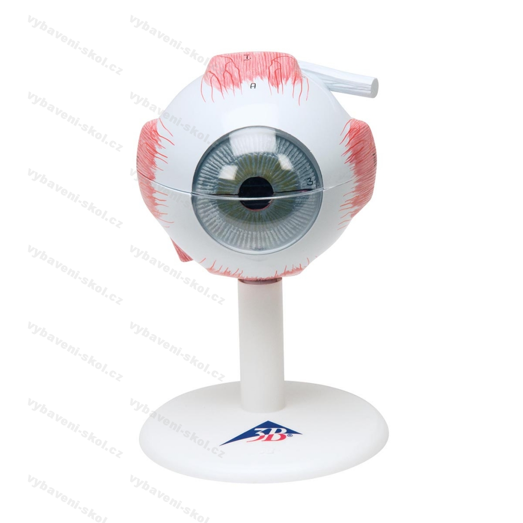Klasický model lidského oka v trojnásobné velikosti. Rozložitelný na 6 dílů. Dvě poloviny bělma s rohovkou a úpony očních svalů. Dvě poloviny cévnatky se sítnicí a duhovkou, čočka a sklivec. Na stojanu. Velikost 9 x 9 x 15 cm, hmotnost 0,14 kg. Špičková kvalita 3B Scientific.