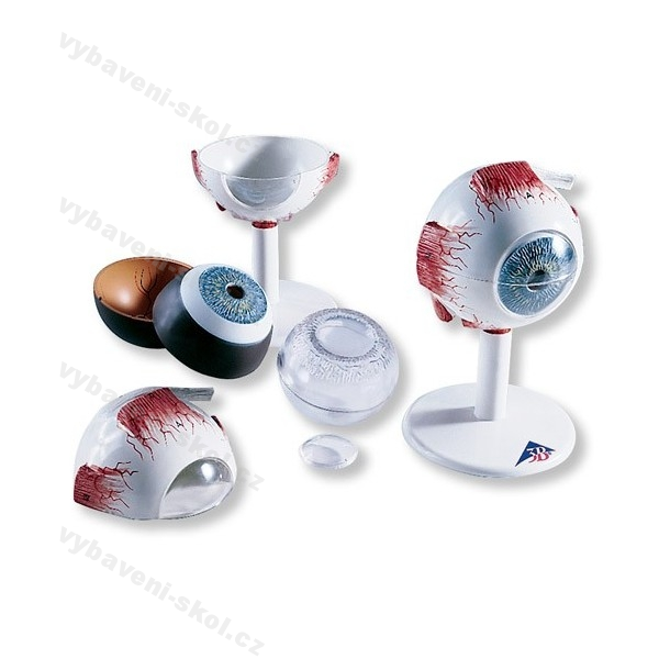 Rozložitelný model lidského oka v trojnásobné velikosti. Dvě poloviny bělma s rohovkou a úpony očních svalů, dvě poloviny cévnatky se sítnicí a duhovkou, čočka a sklivec. Kvalita 3B Scientific.