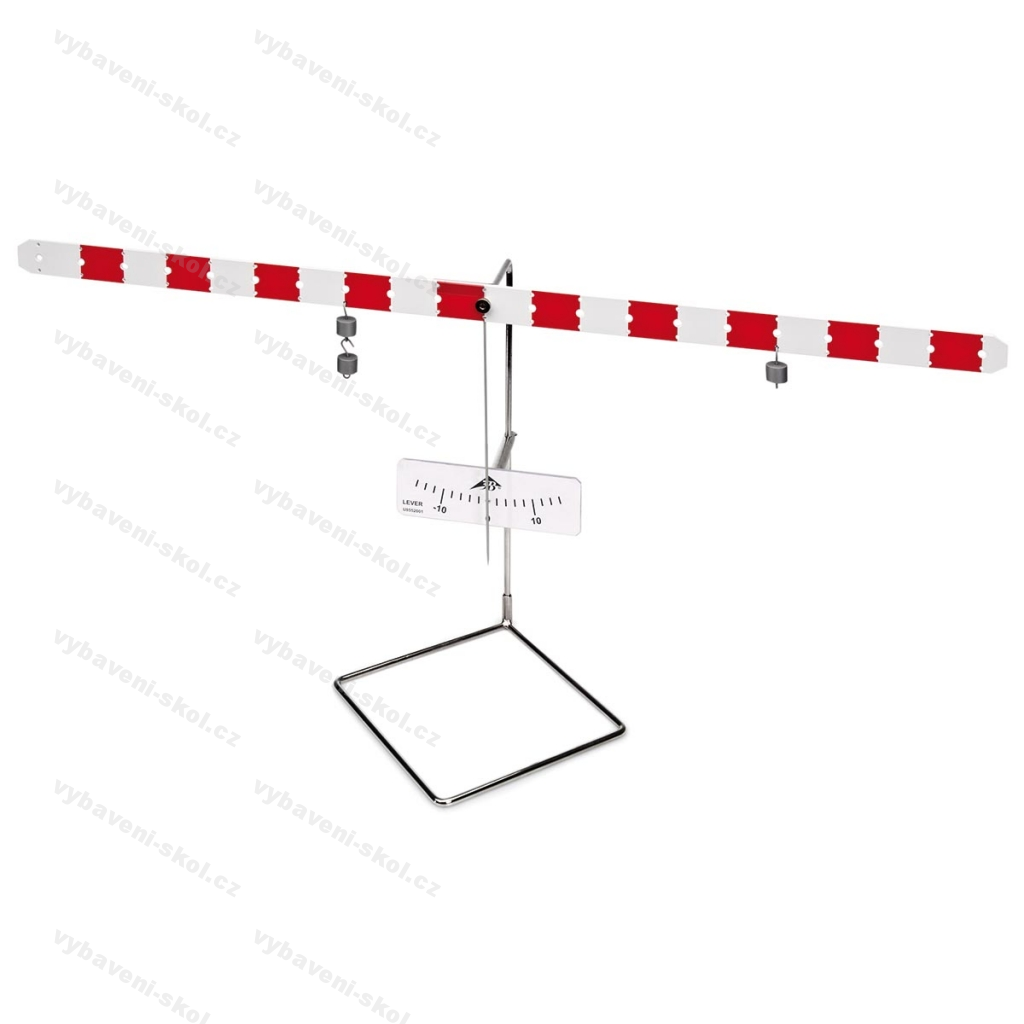 Zařízení k demonstraci rovnováhy na páce. Sestava se skládá ze stavitelného stojanu, ukazatele se stupnicí, páky se třemi řadami otvorů k zavěšení páky na stojan a zavěšení závaží, sady 10 závaží 50 g s háčky pro zavěšení. Možnost demonstrace rovnoramenných vah. Délka páky 1 m. Rozteč otvorů na páce 50 mm.