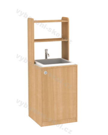 Mycí stůl pro odborné přírodovědné učebny. S keramickým dřezem, chemicky odolnou výlevkou a policovou nástavbou.