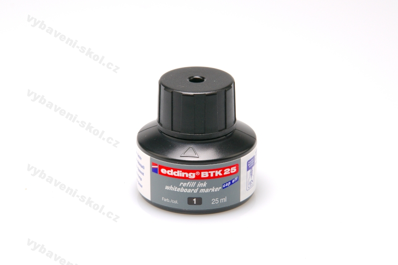 Inkoust černý BTK 25 do popisovače Edding na bílé tabule. Pro rozšroubovatelné i nerozšroubovatelné fixy. 25 ml.