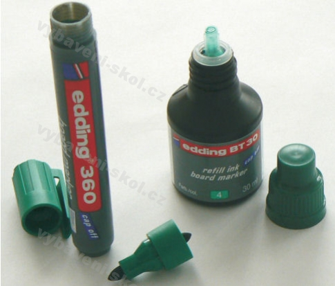 Náhradní inkoust BT 30 doplňujeme do rozšroubovatelného popisovače Edding na bílé tabule (barevně je odlišený pouze uzávěr fixu, ostatní části fixu v jedné barvě). Lahvička je opatřená kapátkem pro snadné naplnění fixu bez zašpinění. Popisovač se rozšroubuje a inkoust nakape dovnitř. Náplň vystačí na cca 10 použití. Barva modrá. V odkaze stažení souborů naleznete podrobnou informaci k plnění popisovačů inkoustem.