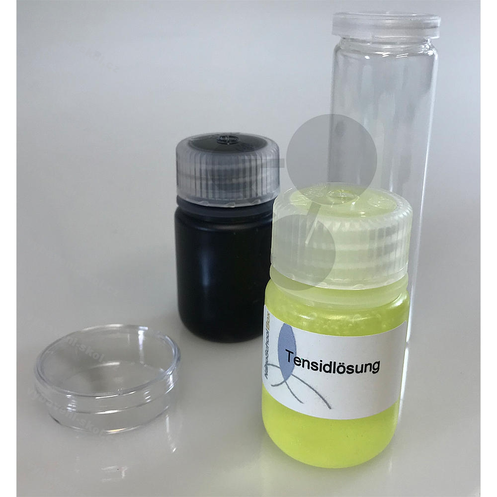 Složení: ferrofluid, lahvička se šroubovacím uzávěrem, tenzidový roztok, magnet, 10 pipet a Petriho miska.