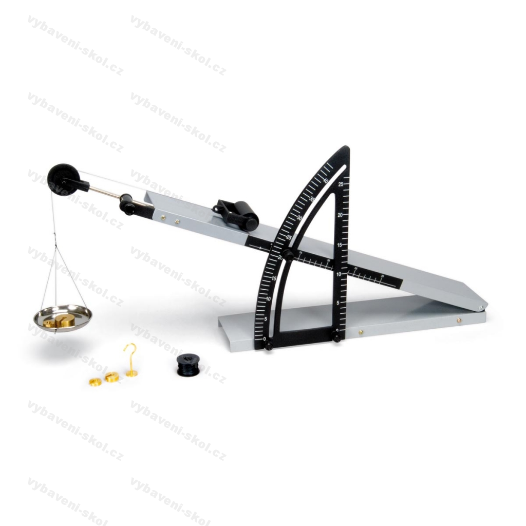 Zařízení ke zkoumání sil, působících na těleso na nakloněné rovině v závislosti na úhlu náklonu. Základna a nakloněná rovina z kovu. Kombinované měřítko pro úhel náklonu, délku a výšku. Dělení po stupních, resp. centimetrech. Nastavitelný náklon od 0° do 45°. Součástí nastavitelná kladka, válec, závěsná miska a motouz. Délka nakloněné roviny 60 cm. Délka základny 45 cm. Doporučené příslušenství: sada závaží 1-500 g a siloměr 10 N.