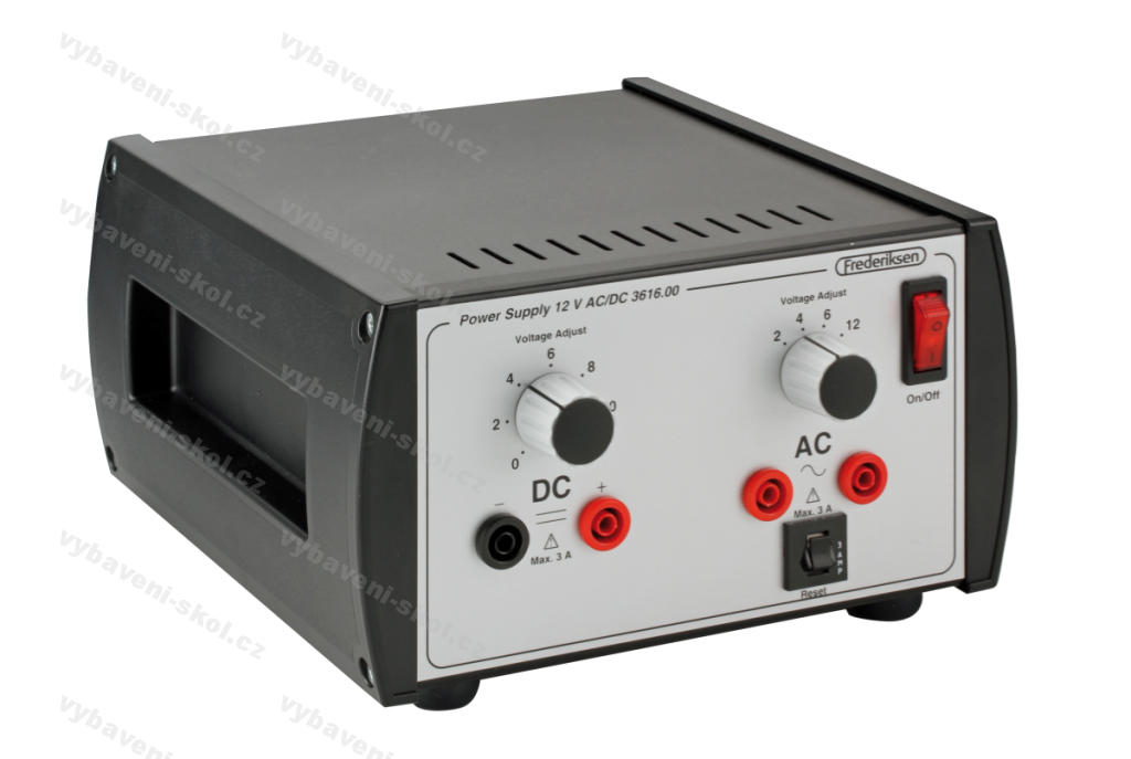 Robustní stabilizovaný žákovský zdroj. Automatická tepelná ochrana proti přetížení. DC 0-12 V, AC 2, 4, 6, 12 V.