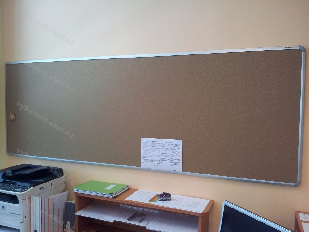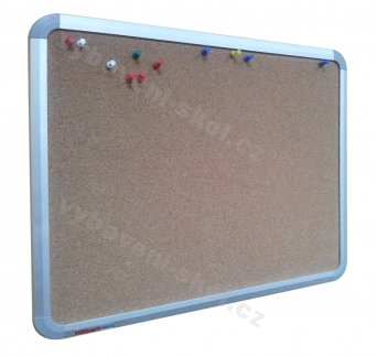 Korek tl. 3 mm, podklad hobra 12 mm. Hliníkový rám s plastovými rohy. Vodorovné i svislé zavěšení.