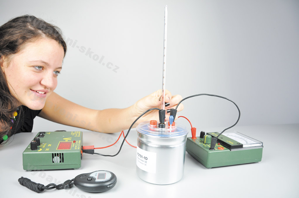 1 x Joulův kalorimetr univerzální, 2 hliníkové nádoby o objemu 150 a 700 ml, oddělené izolací, průsvitný uzávěr se zabudovaným odstupňovaným ponorným vařičem: 2/4/6 Ohm, napájecí napětí: 6V/2A, zátka pro teploměr a jednoduchý míchač