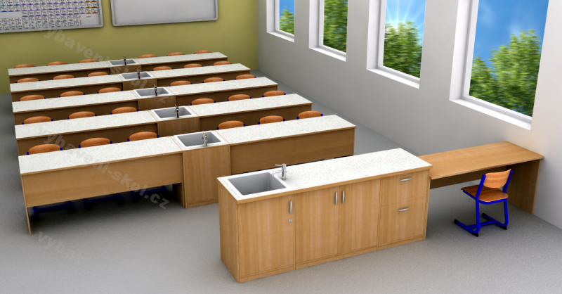 Moderní učebna přírodních věd se studentským pracovištěm uspořádaným do jednotlivých, průchozích řad. Výukové učebny fyziky, chemie tvoří 2 základní pracovní zóny. Jde o kompletní demonstrační pracoviště vyučujícího a samostatný prostor pro studenty. Učebny jsou vybavené kvalitním a odolným pracovním, sedacím a úložným nábytkem (nejvíce namáhané části chráněné ABS hranami), spolu s příslušnými pomůckami a potřebnými rozvody elektřiny, odpadů, plynu a vody. Zázemí přednášejícího tvoří katedra s pohodlnou učitelskou židlí a prostorný demonstrační panel se skříní pro elektrickou výbavu (nízkonapěťový elektrorozvaděč) a mycím stolem. Součástí je laboratorní kahan s butanovou náplní. Studentské pracoviště tvoří řady trojmístných pracovních stolů spolu s mycím boxem. Panel určený pro práci s vodou je osazený keramickým dřezem s chemicky odolnou, odtokovou trubkou. Trojmístné lavice jsou doplněné praktickými stohovatelnými židlemi. Součástí dodávky je odborná montáž. V nabídce níže jsou jednotlivé komponenty celé sestavy odborné učebny již nastaveny v relevantních počtech pro 30 studentů. S položkami je však možné manipulovat, lze je ze sestavy vyloučit, zaměnit za jiné nebo upravit. Pro vytvoření moderní multimediální odborné laboratoře, která přispěje k plnohodnotnému předávání odborných znalostí a aktivnímu zapojení žáků do výuky, nabízíme k doplnění další audiovizuální vybavení, interaktivní funkční tabule, relevantní software ad.