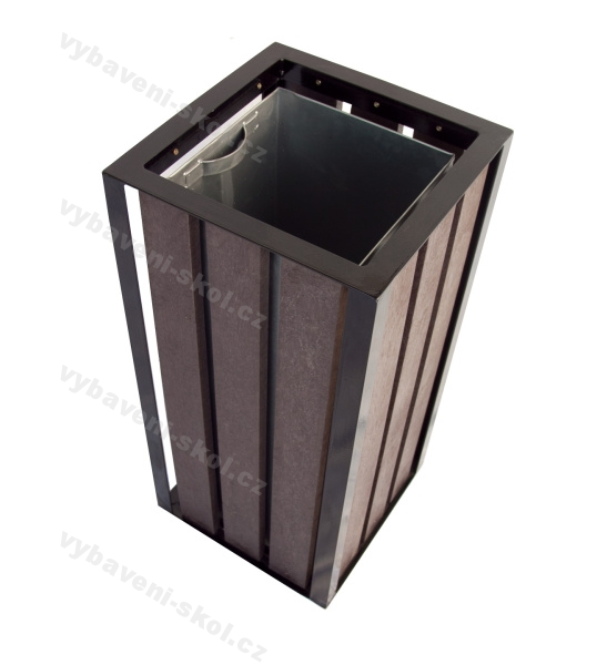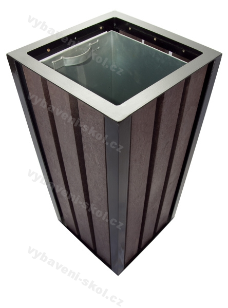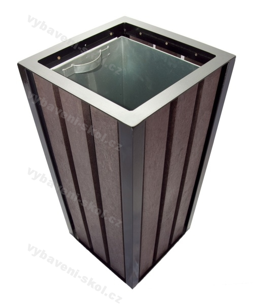 Ocelový plášť koše v kombinaci plastového recyklátu (hnědé barvy) s vyjímatelnou pozinkovanou vložkou.