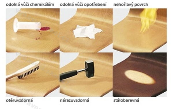 Stohovatelná židle je navržena tak, aby vyhovovala školnímu i kancelářskému prostředí. Korpus židle je vyroben z tlakově tvarované impregnované dýhy. Je téměř nezničitelný, nepoškrábe se, je odolný nárazům i chemickým znečištěním a ohnivzdorný. Splňuje atesty nehořlavosti. Povrch kovového rámu je upraven práškovou vypalovací barvou (komaxit) v odstínech RAL nebo chrom.