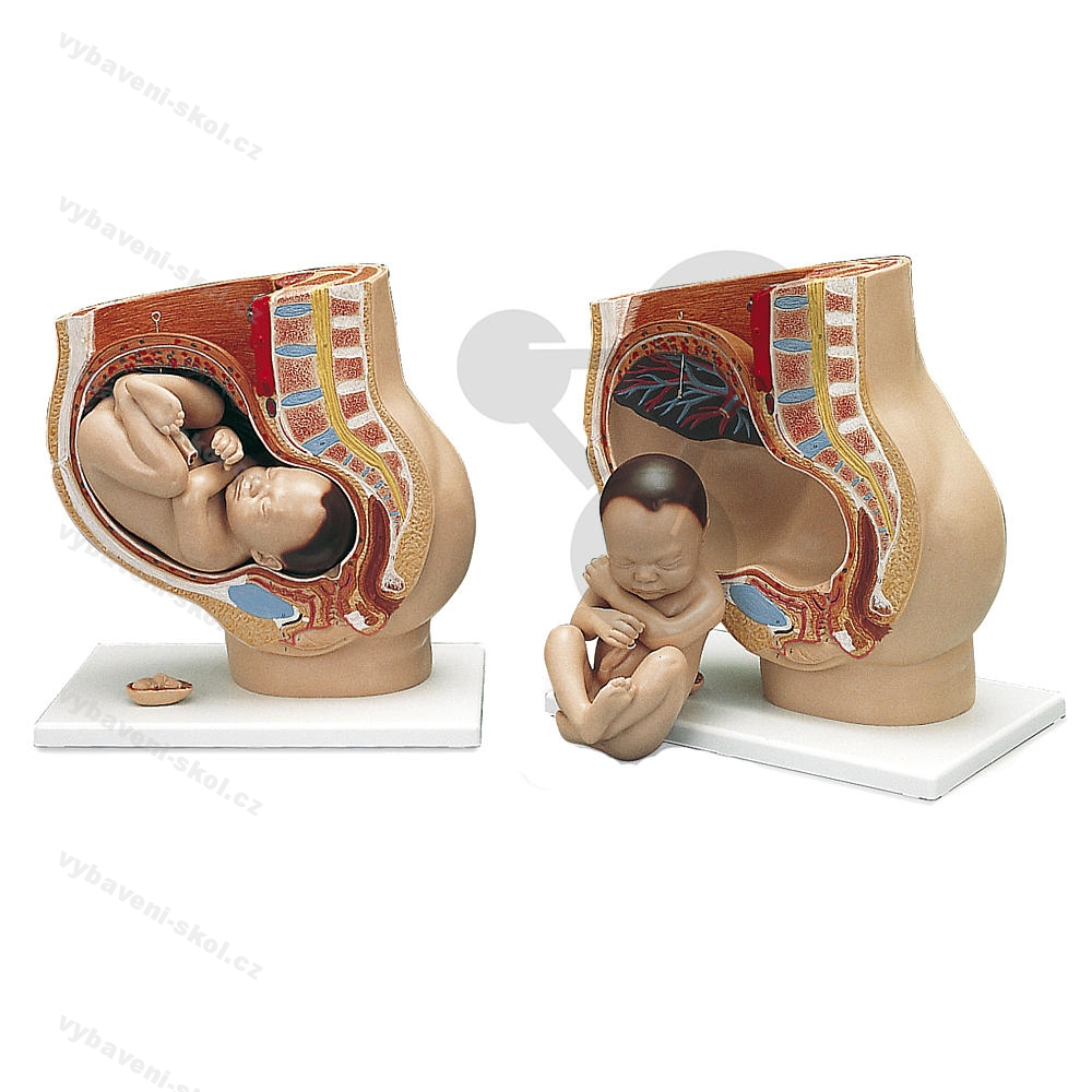 Mediánní řez ženskou pánví ve 40. týdnu těhotenství. Model slouží ke studiu polohy dítěte krátce před porodem. Plod je vyjímatelný. Pro srovnání poměru velikostí je na podstavci zobrazeno embryo ve 3. měsíci těhotenství.