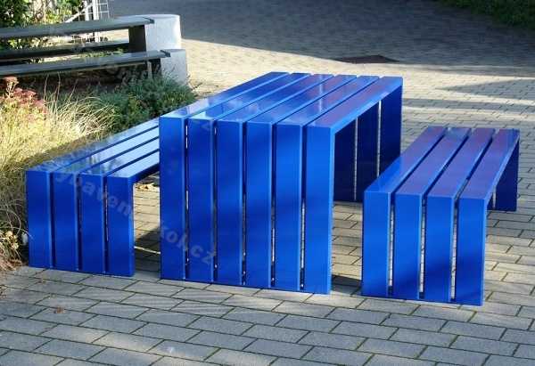 Souprava ocelová Beata originálního tvaru se samostatnými sedáky a stolem. Účelná a krásná vevnitř i venku, oceňovaná díky svému designu. Souprava laviček a stolu přinášejí možnost neobvyklých řešení venkovního sezení. Ocelová kostra parkové soupravy z jeklového profilu 80x30 mm. Konstrukce je ošetřena vypalovanou barvou RAL z naší nabídky nebo žárovým zinkem. Soupravu je možno kotvit k zemi šrouby nebo zvolit variantu určenou k zabetonování. V nabídce také různá délka setu.