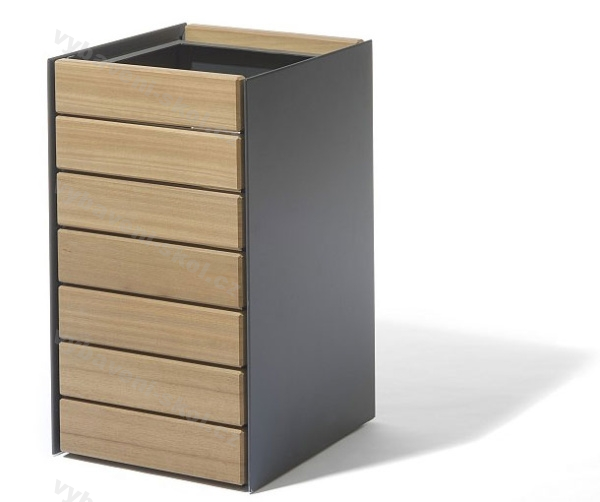 Moderní venkovní odpadkový koš z nové řady městského mobiliáře. Robustní ocelový plášť koše z plechu ošetřen práškovou barvou s výběrem RAL provedení nebo žárovým zinkem a dřevěným obložením, které je impregnováno a třikrát nalakováno lazurou v různých odstínech dle výběru, bez stříšky s vyjímatelnou vnitřní pozinkovanou nádobou. Kotvení koše do betonové patky či na dlažbu nebo betonováním.