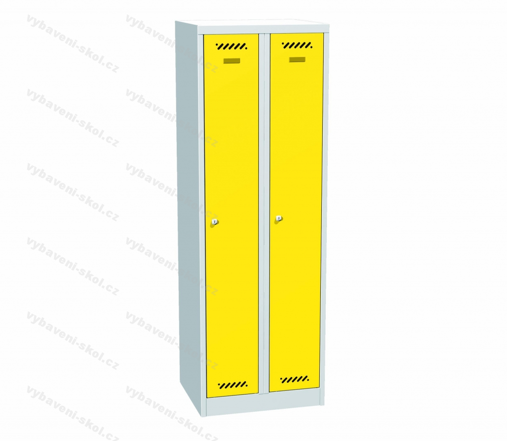 Šatní plechová dvoudílná skříň umístěná na soklu. Úložný prostor je vyplněn policí a šatní tyčí s háčky. Rozměr: 60x180x50 cm (Š x V x H).