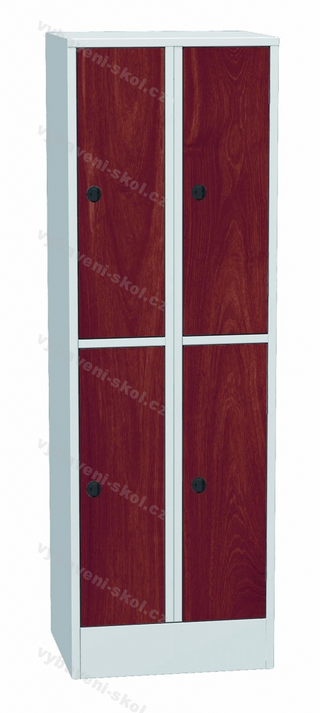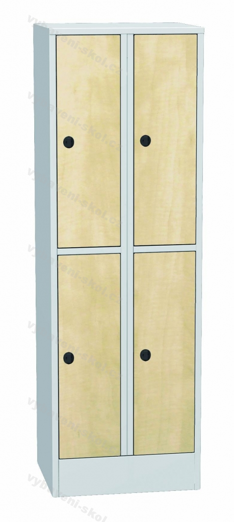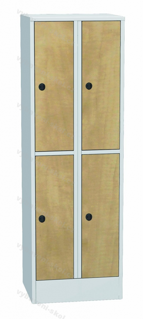 Šatní plechová čtyřdvéřová skříň na soklu s laminátovými dveřmi. Každé šatní oddělení je vybaveno tyčí na šaty a plastovými háčky 60x185x50cm (Š x V x H).
