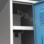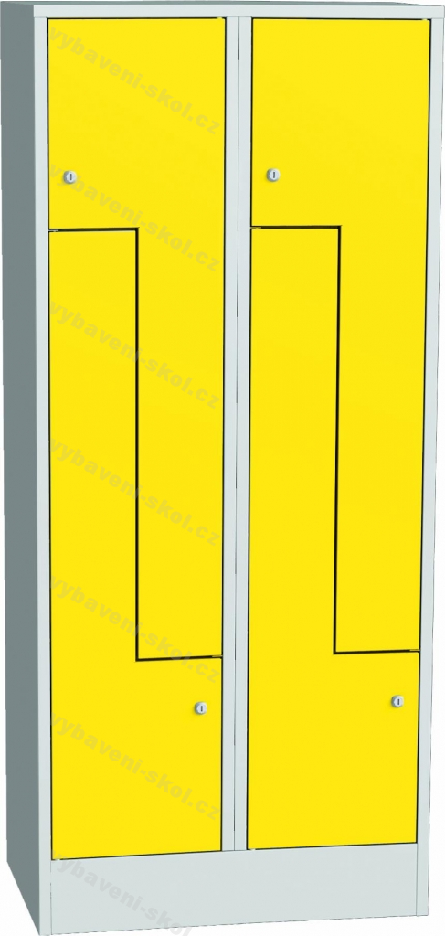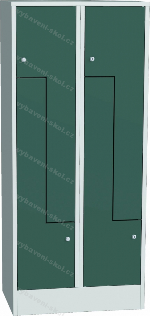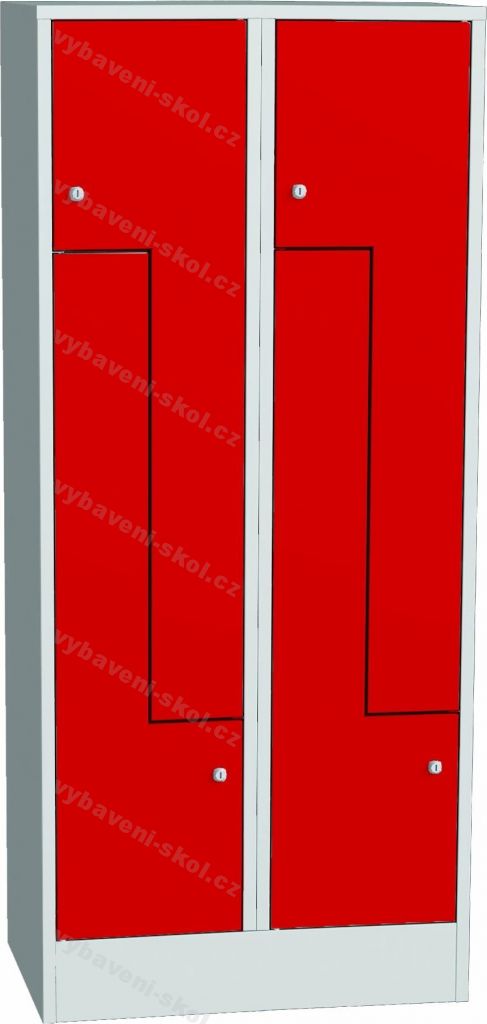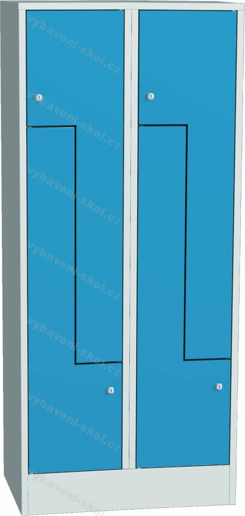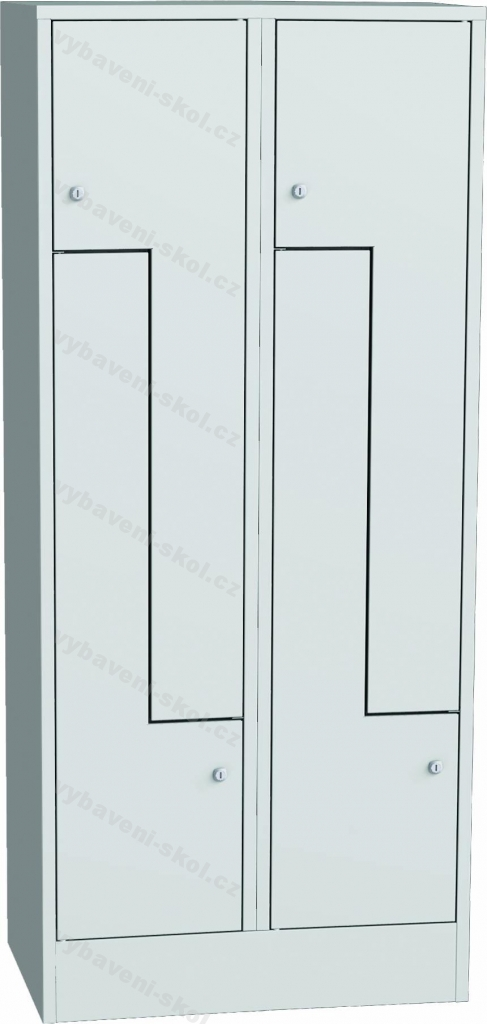 Šatní plechová skříň dvoudílná na soklu. Vnitřní uspořádání tvaru "Z". Každé oddělení je vybaveno šatní tyčí a dvěma plastovými háčky. Rozměry: 80x185x50 cm (Š x V x H).