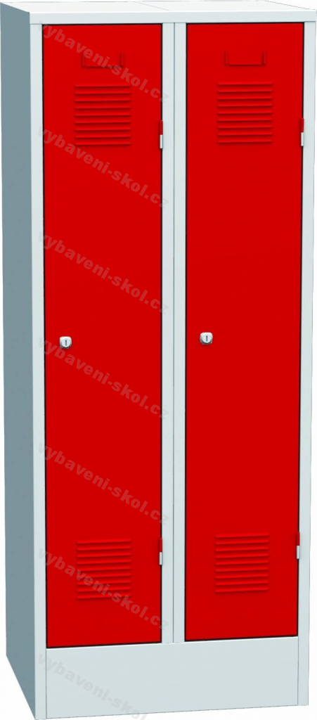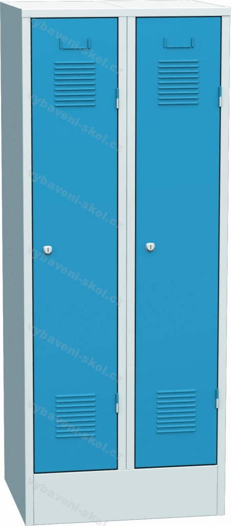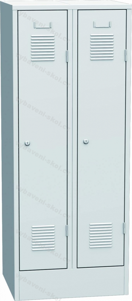 Šatní plechová skříň dvoudílná umístěná na soklu. Úložný prostor je vyplněn policí a šatní tyčí s háčky. Rozměry: 60x150x50 cm (Š x V x H).