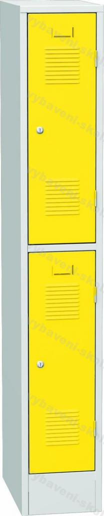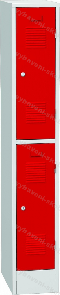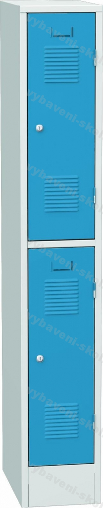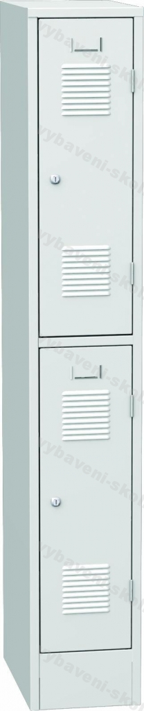 Šatní plechová dvoudvéřová skříň na soklu. Každé šatní oddělení je vybaveno tyčí na šaty a plastovými háčky. Rozměr: 30x185x50 cm (Š x V x H).