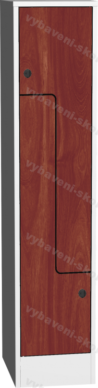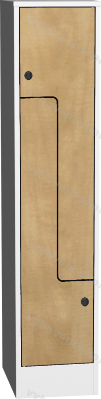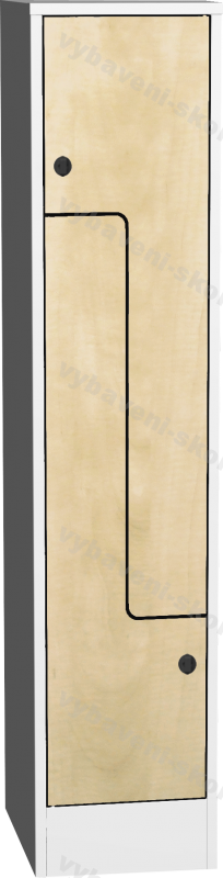 Šatní plechová jednodílná skříň na soklu. Vnitřní uspořádání tvaru "Z" s laminátovými dveřmi. Každé oddělení je vybaveno šatní tyčí a dvěma plastovými háčky. Rozměry: 40x185x50 cm (Š x V x H).