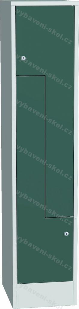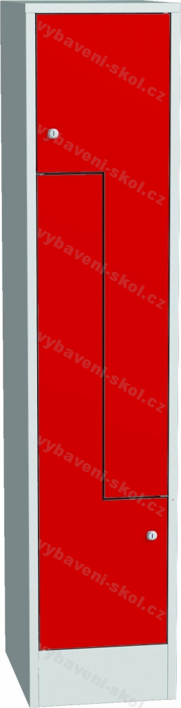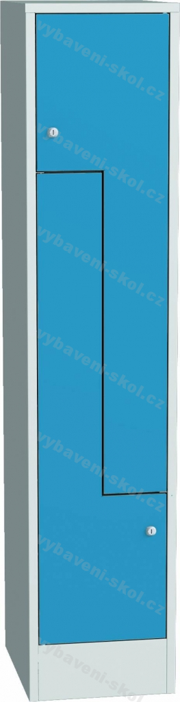Šatní plechová skříň jednodílná na soklu. Vnitřní uspořádání tvaru "Z". Každé oddělení je vybaveno šatní tyčí a dvěma plastovými háčky.Rozměr: 40x185x50 cm (Š x V x H).