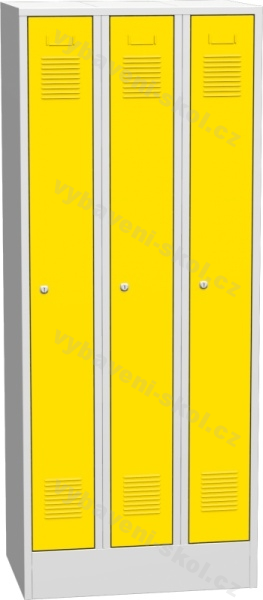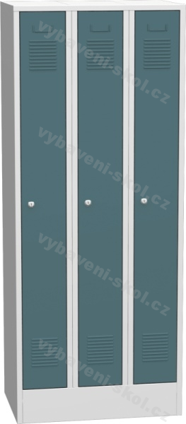Vysoká trojdílná šatní skříň o rozměrech 75x185x50cm (Š x V x H), z kvalitního materiálu. Konstrukce je z ocelového plechu lakovaného odolnou práškovou barvou (standardně šedá RAL 7035). Spodní část skříně tvoří stabilní sokl. Vnitřní prostor tvoří police a tyč na oděv se 3 plastovými háčky. Dveře skříně lze vyhotovit v několika variantách (výběr barvy, zámků, větrání, rozvorového systému).