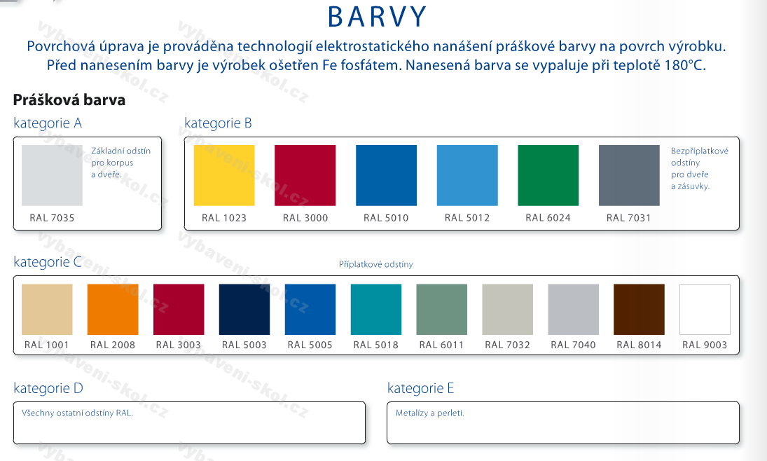 Zvolte bezpříplatkovou barvu RAL spadající do kategorie A a B nebo příplatkovou barvu RAL z kategorie C, D a E, jejíž cenu kalkulujeme individuálně dle počtu kusů. Vybranou příplatkovou barvu RAL napište do poznámky a my Vám obratem zašleme cenovou kalkulaci.