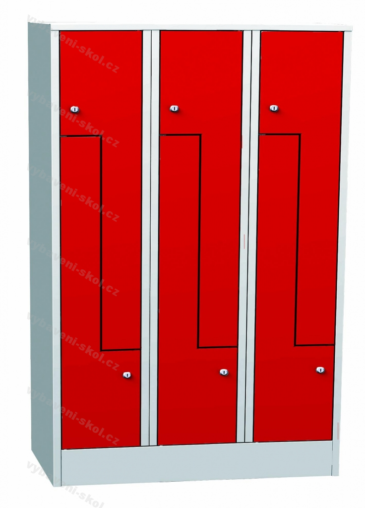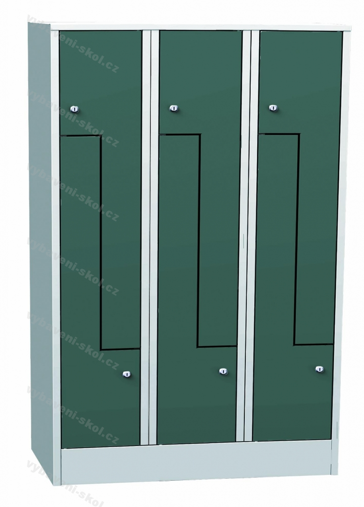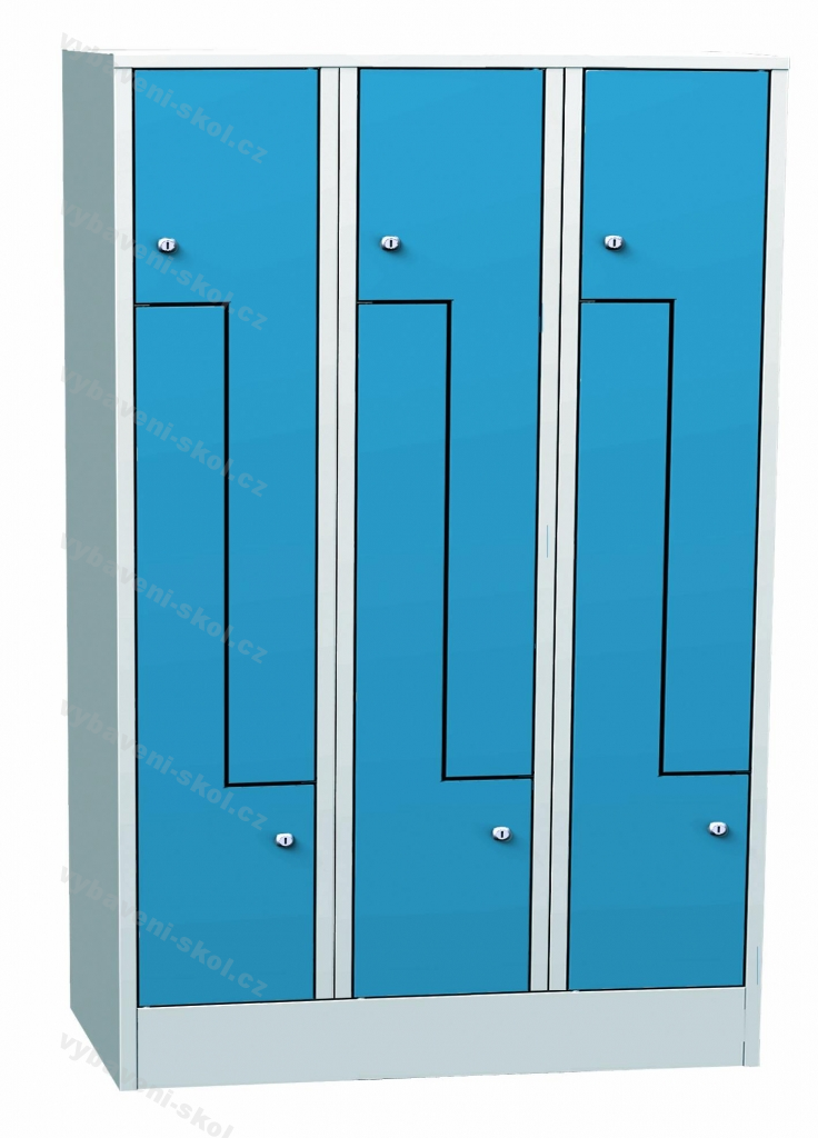 Šatní plechová skříň třídílná na soklu. Vnitřní uspořádání tvaru "Z". Každé oddělení je vybaveno šatní tyčí a dvěma plastovými háčky. Rozměr: 120x185x50 cm (Š x V x H).