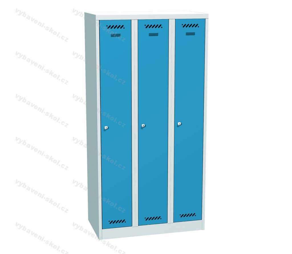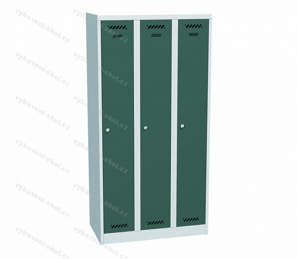 Šatní plechová třídílná skříň umístěná na soklu. Úložný prostor je vyplněn policí a šatní tyčí s háčky. Rozměr: 90x180x50 cm (Š x V x H).