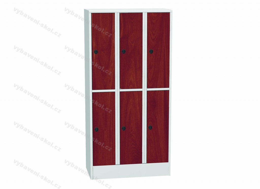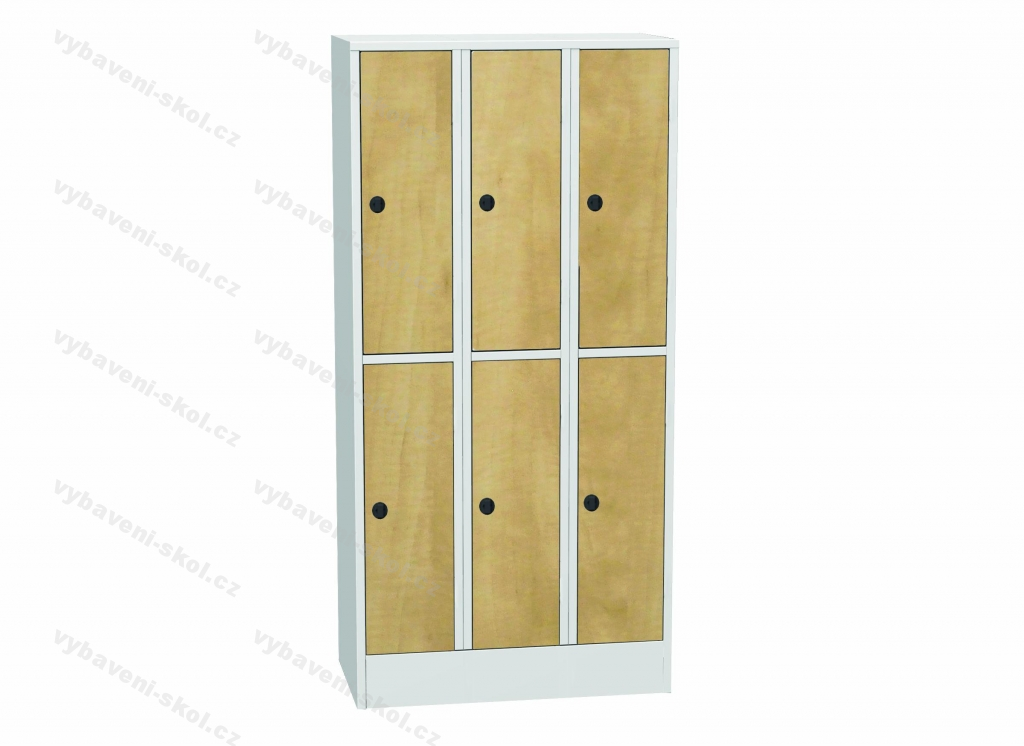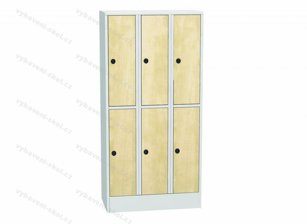 Šatní plechová šestidvéřová skříň na soklu s laminátovými dveřmi LTD. Každé šatní oddělení je vybaveno tyčí na šaty a plastovými háčky. Rozměry: 90x185x50 cm (Š x V x H).