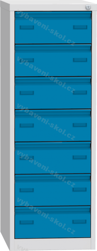 Plechová skříň na kartotéky, slouží především k ukládání dokumentů formátu A6, pořadačů, archiválií a nejrůznějších médií. Standardní povrchová úprava je práškovou barvou v barvě RAL 7035 (šedá) a čela zásuvek s možností zvolit barvu RAL. U některých produktů nabízíme čela zásuvek a povrch dveří z lamina. Základním vybavením registrační skříně jsou profilovaná čela zásuvek, plastové štítky pro vložení jmenovek, oddělovací přepážkou zásuvky, cylindrickým zámkem, blokací proti vysunutí více zásuvek najednou. Jednotlivé díly obsahují dvě zásuvky. Nosnost jedné zásuvky je max. 40 kg.