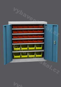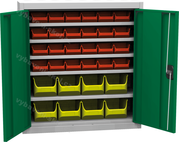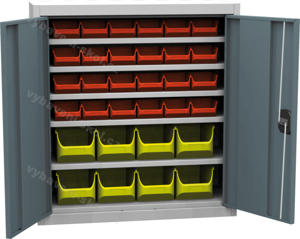 Efektivní a systematickou možnost uskladnění různého materiálu poskytuje nízká zásobníková dílenská skříňka. Tvoří ji stabilní ocelová konstrukce šedé barvy RAL s dvoukřídlými dveřmi s možností volby typu dvířek a výběru barvy RAL, vnitřní prostor je vybaven 5 pevnými policemi. Police jsou výškově stavitelné po 25 mm s nosností 60 kg a s plastovými zásobníky na pracovní nářadí a drobné součástky. Vnitřní vybavení skříně je možno přizpůsobit požadavkům zákazníka. Zásobníkové dílenské skříně se uzamykají cylindrickým zámkem BURG C5 s dvoubodovým mechanismem. Zámek má 2000 kombinací (možnost dodání systému centrálního klíče). Nosnost korpusu cca 300 kg.