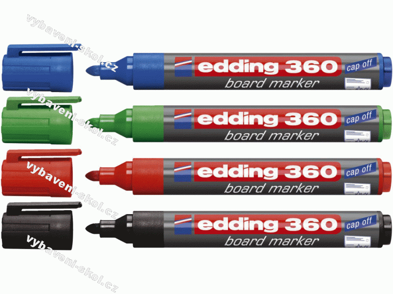 Základní doplněk flipchartu, nástěnky, tabule s bílým povrchem. Popisovací fix modré barvy je vhodný pro psaní, značení, zvýrazňování hladkých povrchů z materiálu (email, melamin, sklo, ad.). Je dobře viditelný a čitelný, snadno se stírá za sucha, je odolný vůči světlu. Rychleschnoucí popisovač Edding 360 má hrot o průměru 1,5-3 mm, možnost výměny opotřebovaných špiček. Plastový obal obsahuje kvalitní náplň a systém Cap-off zabraňuje vysychání fixu při otevřeném hrotu (i několik dní). Bez přídavku butylacetátu. Náplň lze doplňovat, náhradní inkousty v nabídce (BTK 25). V odkaze stažení souborů naleznete návod k plnění popisovačů inkoustem.