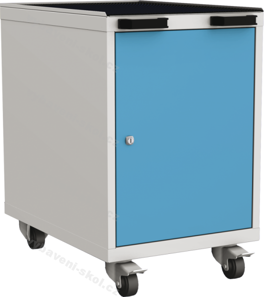 Uzavřený plechový kontejner jako praktická mobilní součást svařovaného pracovního stolu. Je vyrobený z ocelového plechu o síle 1 mm šedé barvy RAL, max. nosnost korpusu je 300 kg. Úložný prostor tvoří 2 police kryté jednodílnými dveřmi s možností zvolit barvu RAL. Vnitřní strana dveří je vybavena Q-SYSTÉM perforací pro uchycení držáků na nářadí. Vrchní část kontejneru je opatřena rámečkem s gumovou výplní a madly pro uchopení kontejneru, spodní část je položena na 2 otočných (s brzdou) a 2 pevných kolečkách. Povolené zatížení kontejneru s podvozkem je max. 300 kg. (Budete-li požadovat jiné dovybavení kontejneru, kontaktujte nás, bude Vám navržena kalkulace dle vašich požadavků).