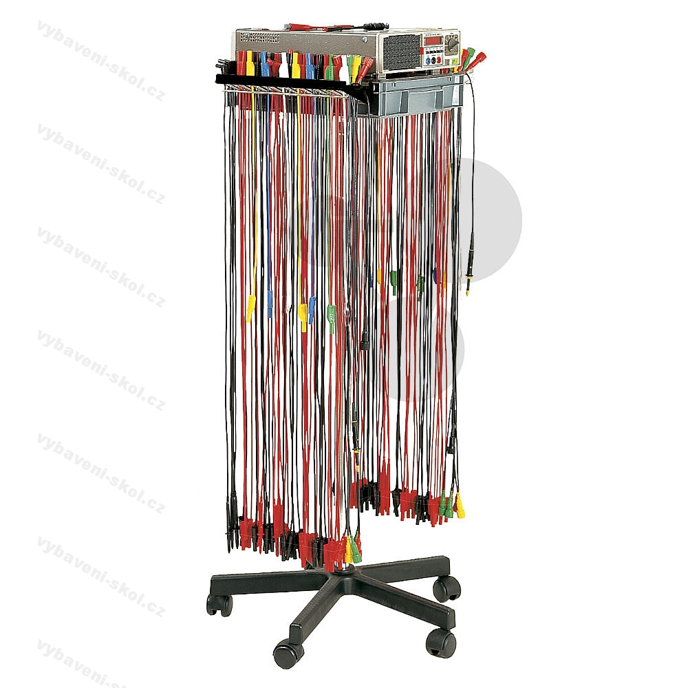 Tento pojízdný držák je vhodný pro zavěšení a přepravu měřících vodičů v laboratoři i ve třídě. Skládá se z 2 hliníkových lišt o délce 250 mm, na které lze zavěsit minimálně 120 měřících vodičů. Kromě toho máte navíc k dispozici plastovou vanu, do níž můžete položit své měřící přístroje (multimetr atd.). Tuto vanu můžete nastavit do výšky od 1 do 1,8 m.