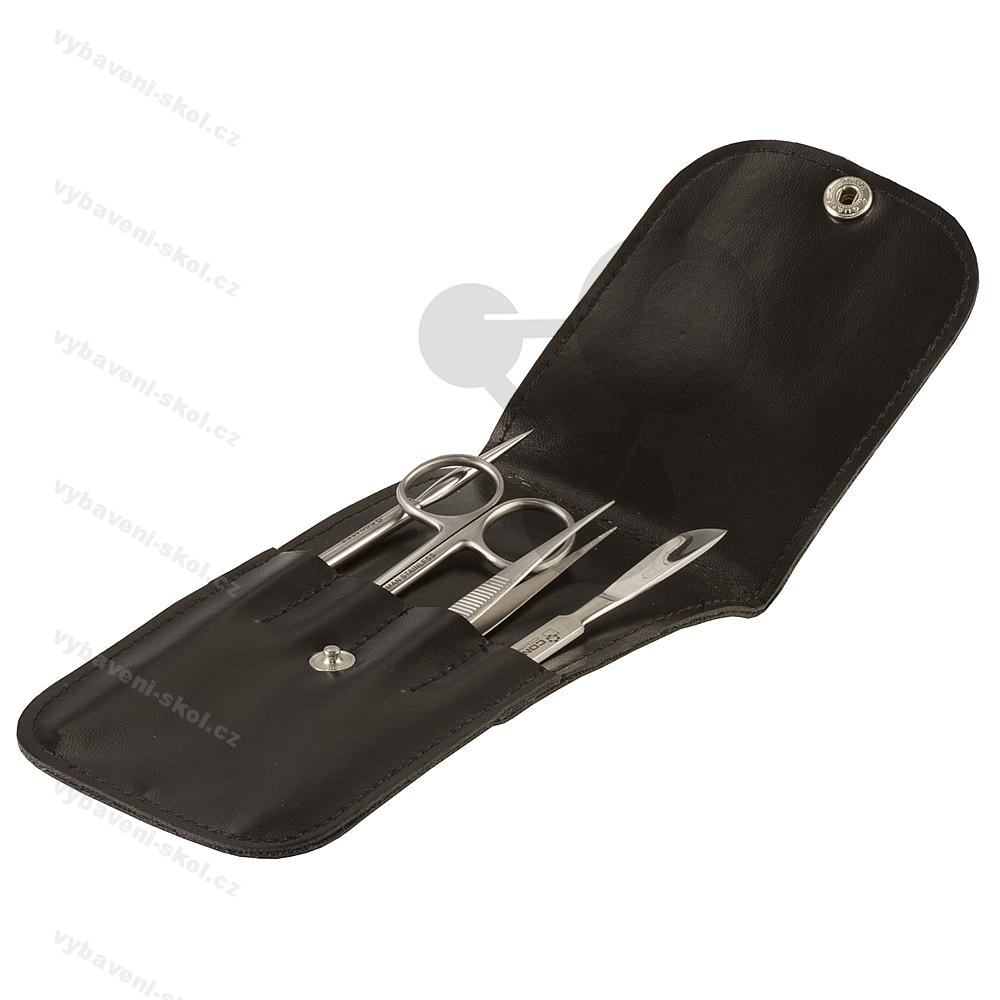 Pouzdro se 4 preparačními nástroji. Pinzeta, skalpel, jehla, mikroskopovací nůžky.