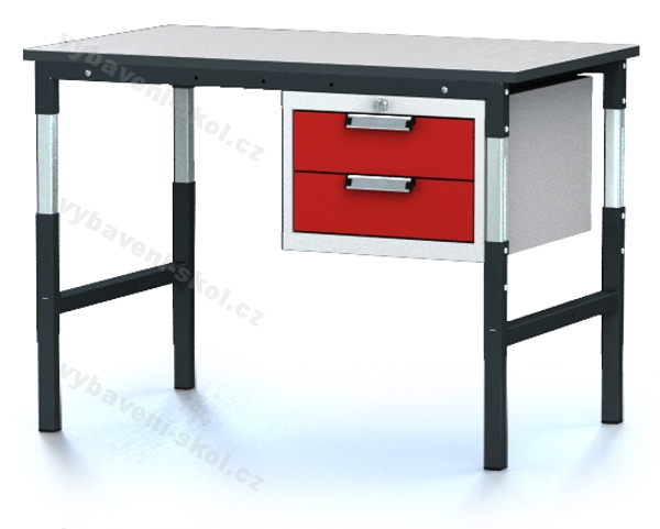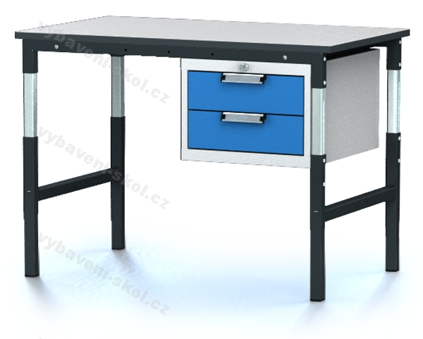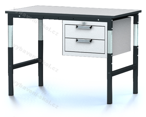 Výškově stavitelný pracovní (dílenský) stůl s dvouzásuvkovým kontejnerem. Rozměry: 68,1-103,7x120x70 cm (VxŠxH). Zásuvky kontejneru stejného rozměru 3U.