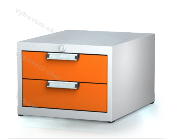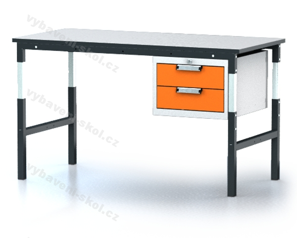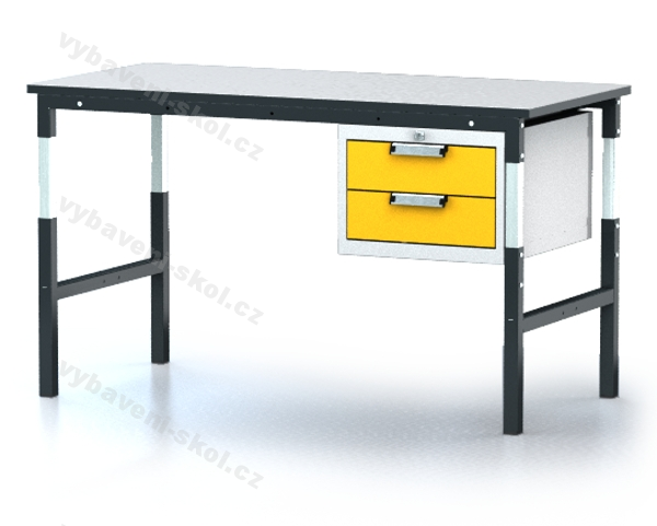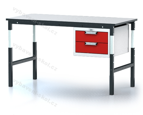 Výškově stavitelný pracovní (dílenský) stůl s dvouzásuvkovým kontejnerem. Rozměry: 68,1-103,7x150x70 cm (VxŠxH). Zásuvky kontejneru rozměru 3U, 3U.