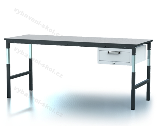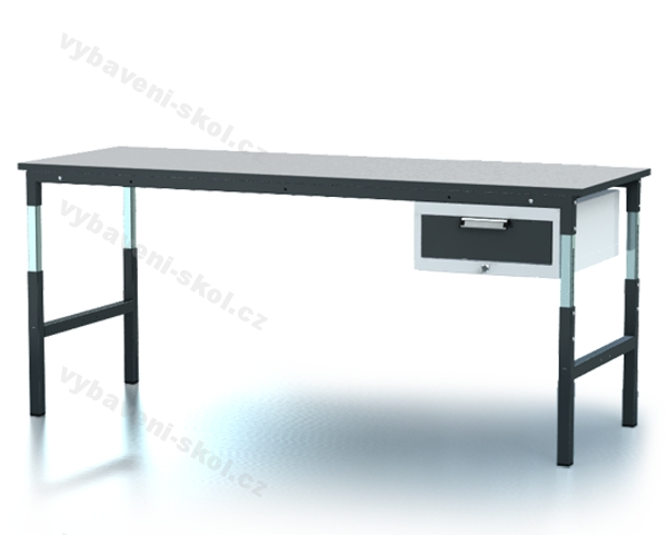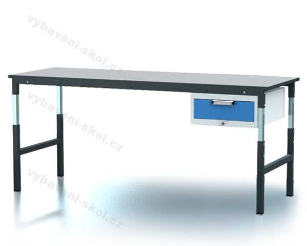 Výškově stavitelný pracovní (dílenský) stůl s jednozásuvkovým kontejnerem. Rozměry: 68,1-103,7x200x70 cm (VxŠxH). Zásuvka kontejneru rozměru 3U.