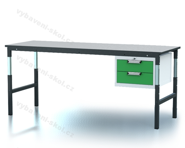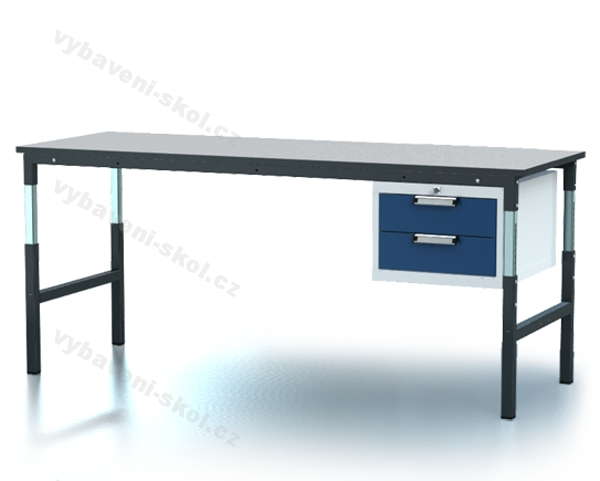 Výškově stavitelný pracovní (dílenský) stůl s dvouzásuvkovým kontejnerem. Rozměry: 68,1-103,7x200x70 cm (VxŠxH). Zásuvky kontejneru rozměru 3U a 3U.