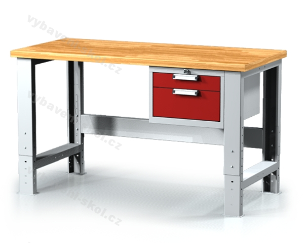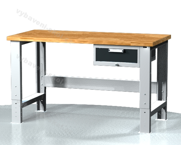 Výškově stavitelný pracovní (dílenský) stůl z profilovaného plechu. Rozměry: 70-105,5x150x70 cm (VxŠxH).