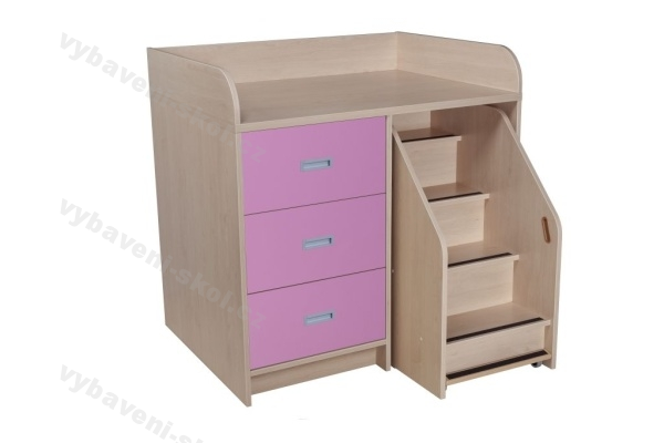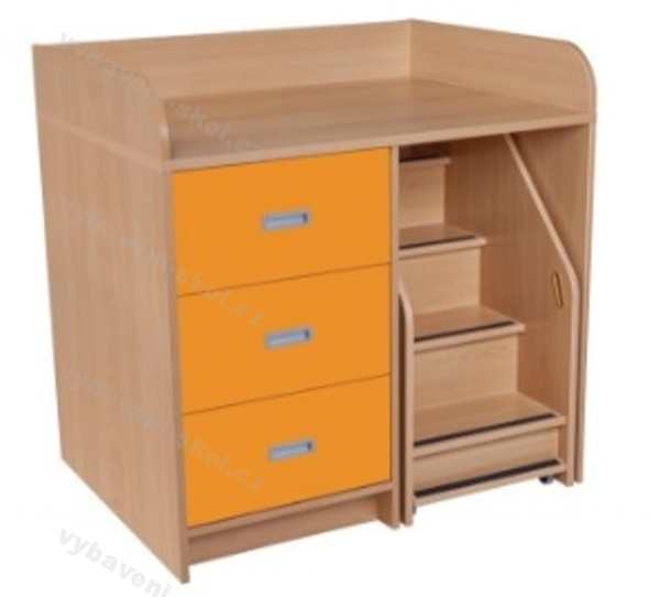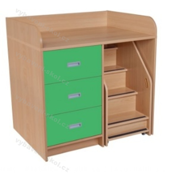 Přebalovací pult se třemi zásuvkami a zasouvacími schůdkami. Rozměr: 105x79x110 (ŠxHxV).