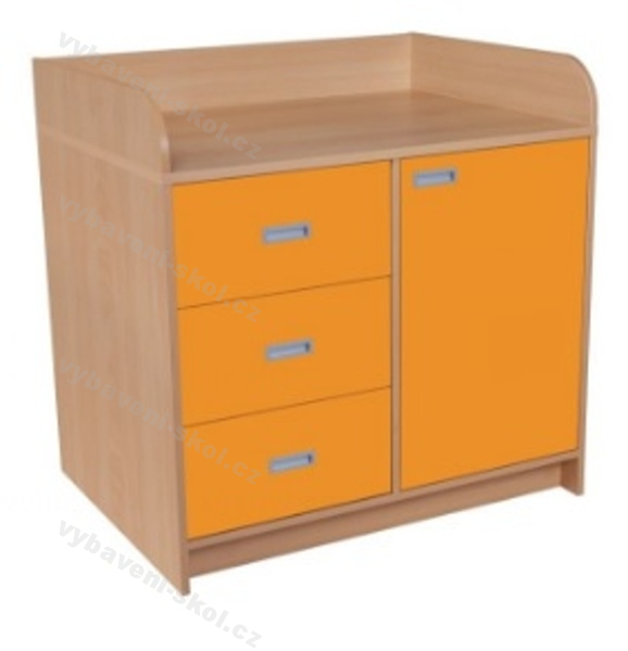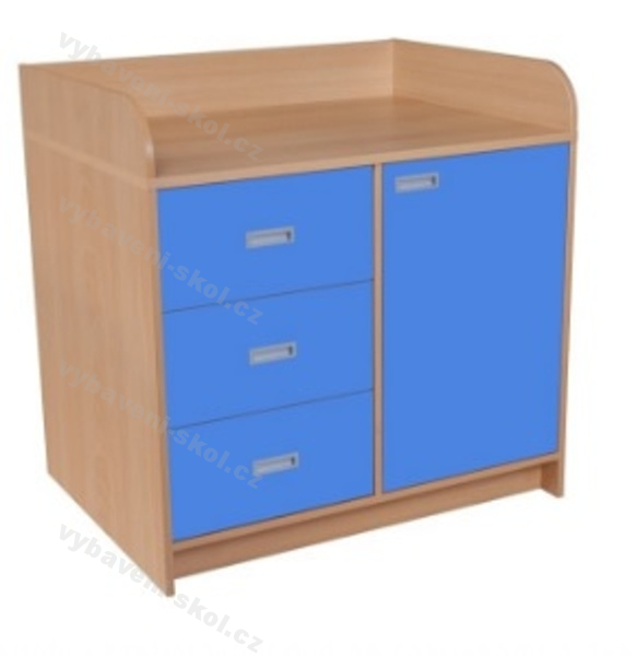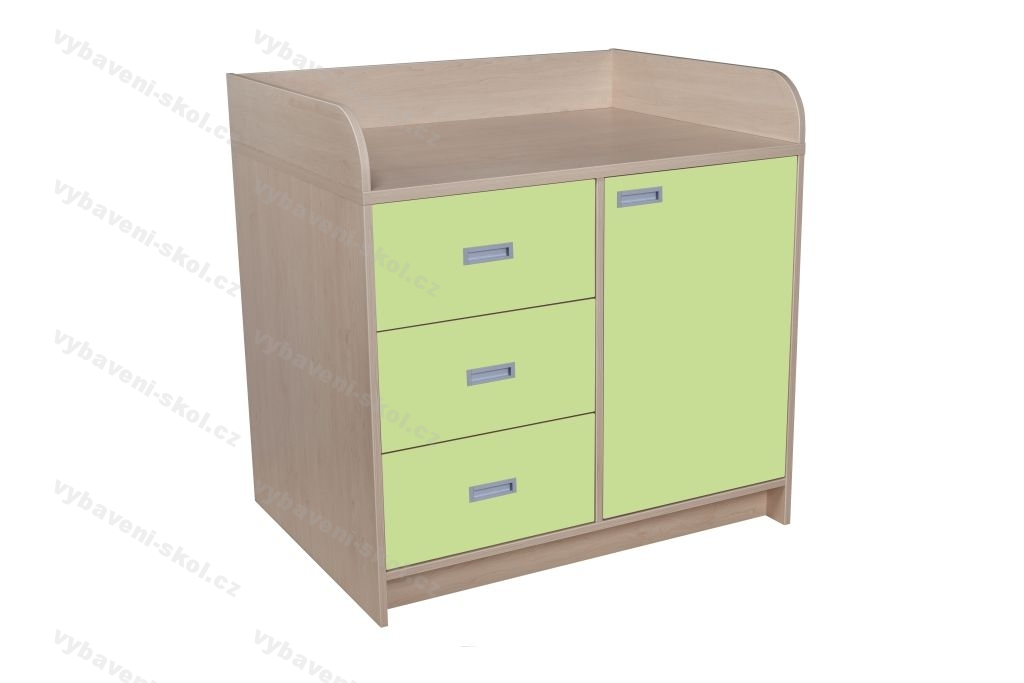 Praktická přebalovací skříňka se hodí do všech prostor, kde se pohybují nejmenší děti pro zajištění jejich komfortu. Korpus skříňky je vyroben z laminované dřevotřísky o síle 18 mm v dezénech buk, javor, bříza a bílá, namáhané plochy korpusu a dvířek a zásuvek chrání 2 mm ABS hrana. Dvířka a zásuvky skříňky jsou vyráběné z laminované dřevotřísky o síle 18 mm a nabízíme je v několika barevných variantách z naší nabídky. Praktické úchytky jsou zapuštěné, aby nedocházelo k úrazu. K přebalovací skříňce doporučujeme zakoupení přebalovací podložky k dispozici v naší nabídce. Výška okraje přebalovací plochy je 20 cm.