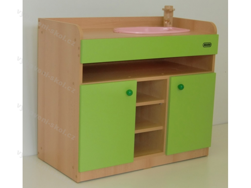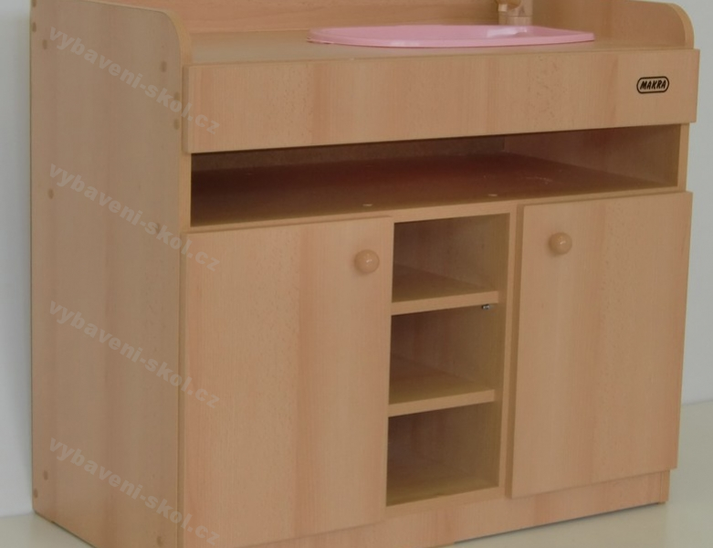 Přebalovací stůl s vaničkou a vodovodním kohoutkem pro všechny malé maminky. Je vybavený otevřeným i uzavřeným úložným prostorem pro oblečení na panenky, koupací kosmetiku a potřeby. Korpus stolu je standardně vyráběn ve dvou dezénech lamino desek o síle 18 mm. Dvířka skříňky jsou v několika barevných provedeních lamino desek o síle 18 mm. Všechny namáhané plochy jsou opatřeny 0,5 až 2 mm ABS hranou, která je chrání před poničením s možností výběru barevného provedení.