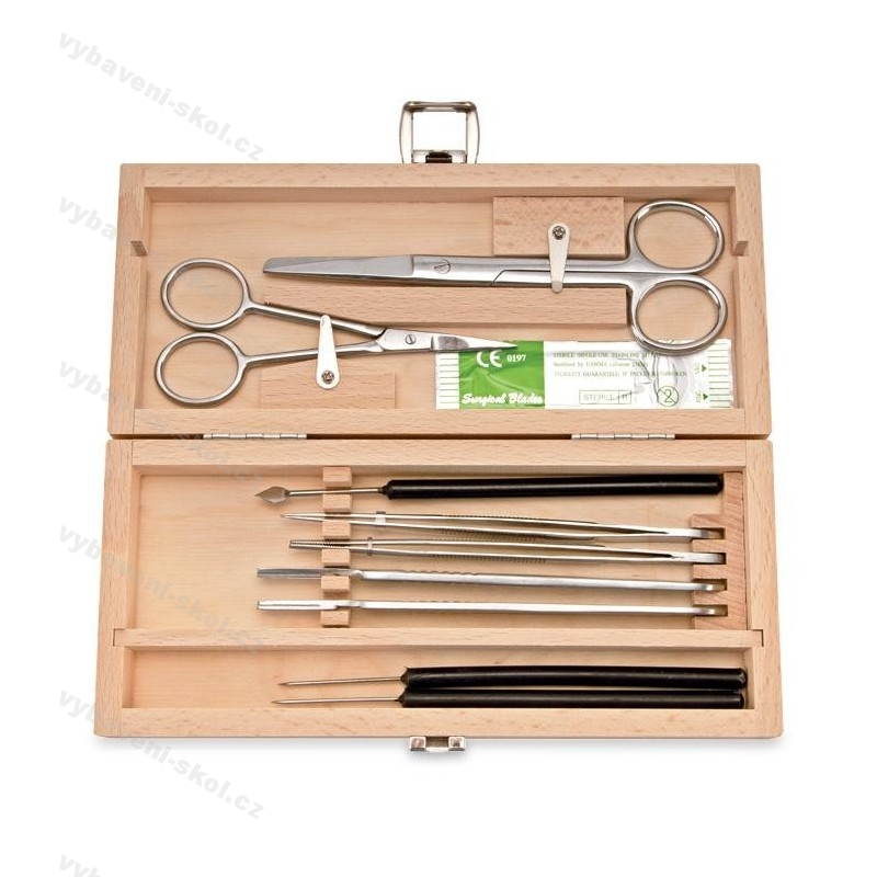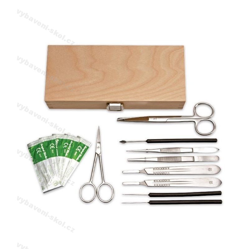 Preparační souprava v dřevěné krabici. Obsahuje chirurgické jehly, obvazovací a chirurgickou pinzetu a nůžky, skalpelovou rukojeť, výměnné čepele skalpelu.