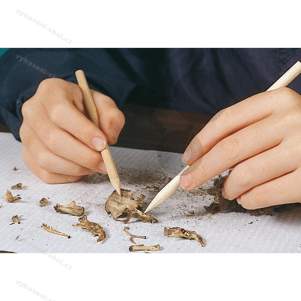 6 kusů sterilizovaných vývržků zabalených v hliníku. Preparací vývržků a přiřazením v nich nalezených kostí mohou žáci zjistit, jaká zvířata se nacházejí na seznamu úlovků sov.
