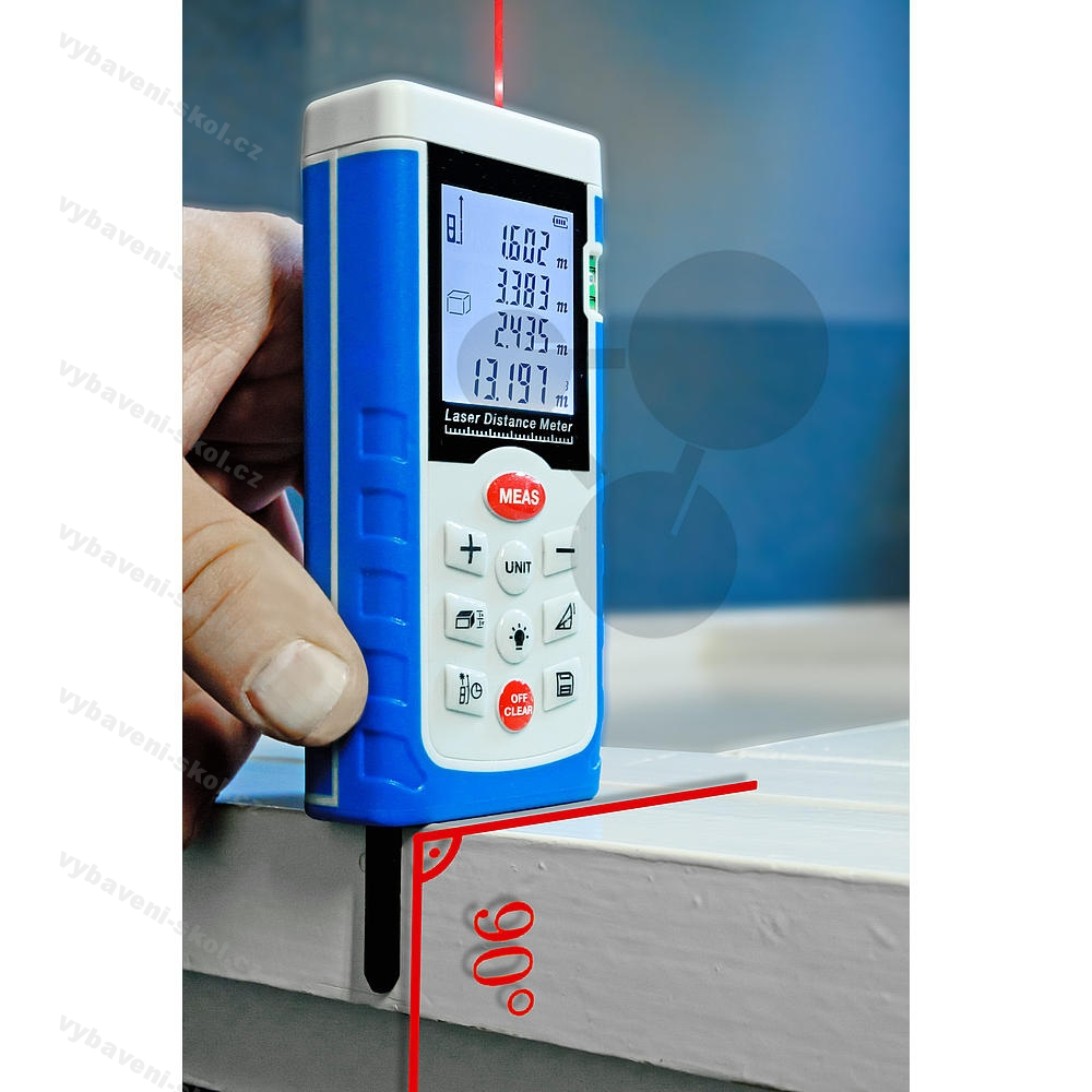 Profesionální laserový dálkoměr s víceřádkovým, podsvíceným LCD displejem. Vhodný pro přesné měření větších vzdáleností (až 60 m). Umožňuje sčítání, odečítání, použití Pythagorovy věty, spolehlivý a rychlý výpočet povrchů a objemů. Ve vestavěné paměti lze zaznamenat až 99 výsledků měření. Skládací 90° úhelník (na spodní straně přístroje) zajistí přesné vyrovnání při měření.
