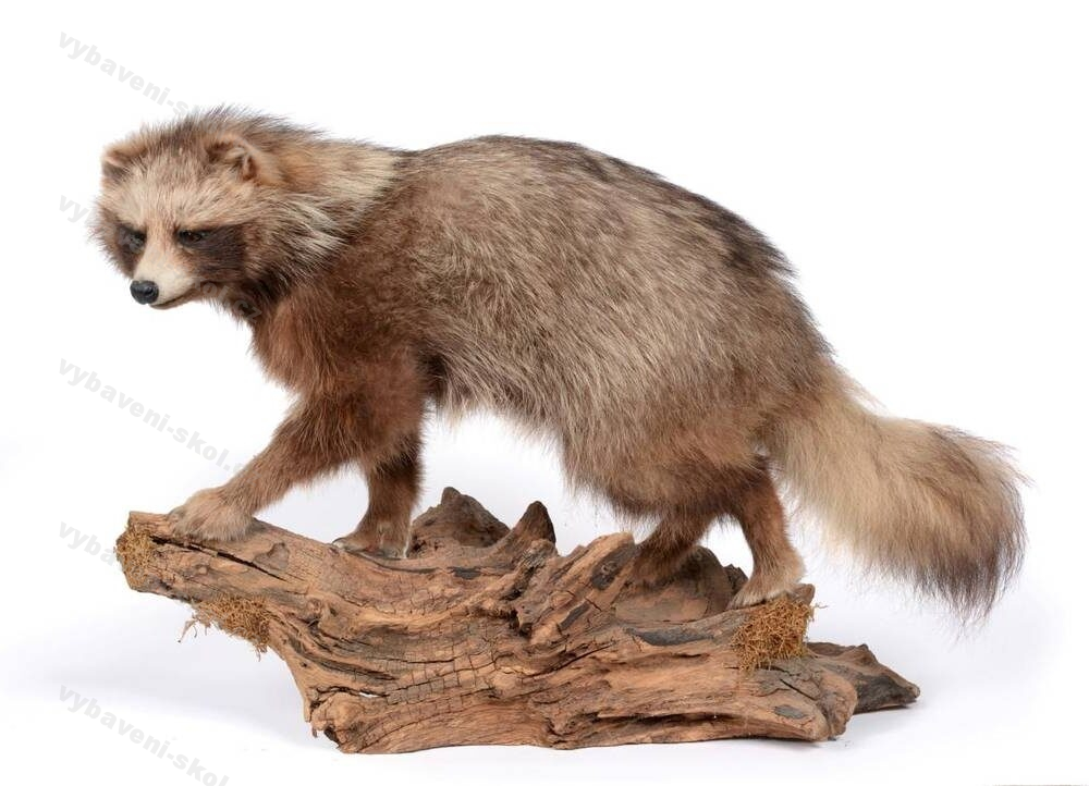 Reálný dermoplastický preparát psíka mývalovitého v reálné pozici.