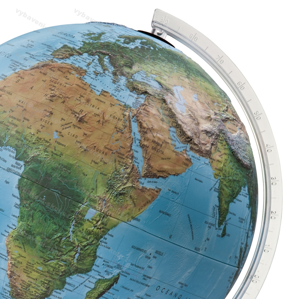 Stolní globus s osvětlením. Dvojí kartografické zobrazení se 3D reliéfem pohoří. Při nezapnutém osvětlení je viditelné fyzikální zobrazení. Při rozsvícení pak politické zobrazení s kontrastními hranicemi jednotlivých států. Veškeré popisy na globusu v angličtině. Pevný plastový stojan vyztužený kovem. Transparentní plastový meridián. Osvětlení 25W / E14, 230 V.