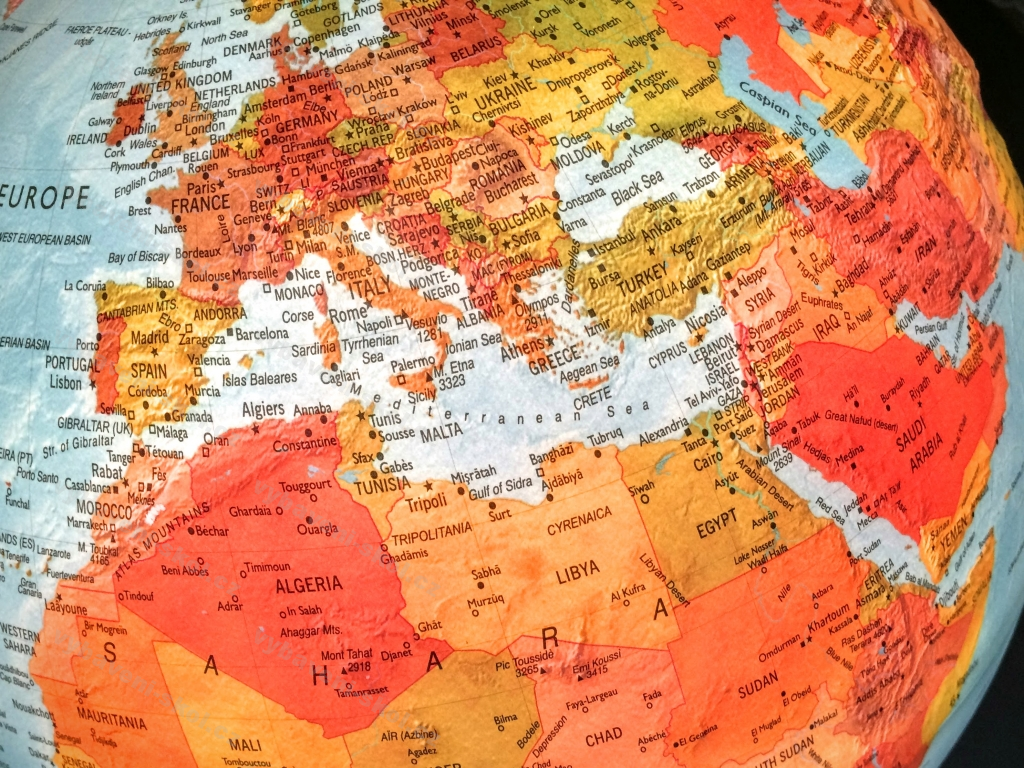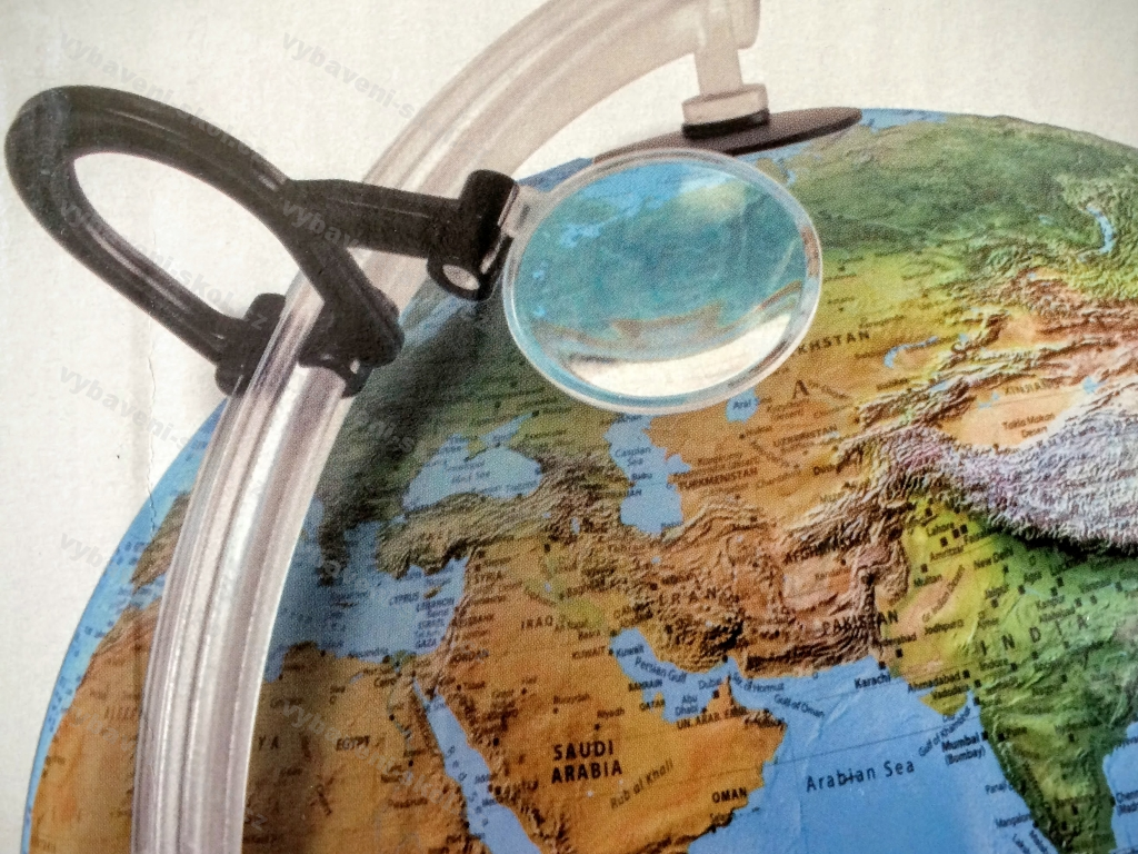 Stolní globus s osvětlením. Dvojí kartografické zobrazení se 3D reliéfem pohoří. Při vypnutém světle viditelné fyzikální zobrazení, při zapnutém politické zobrazení s hranicemi států.